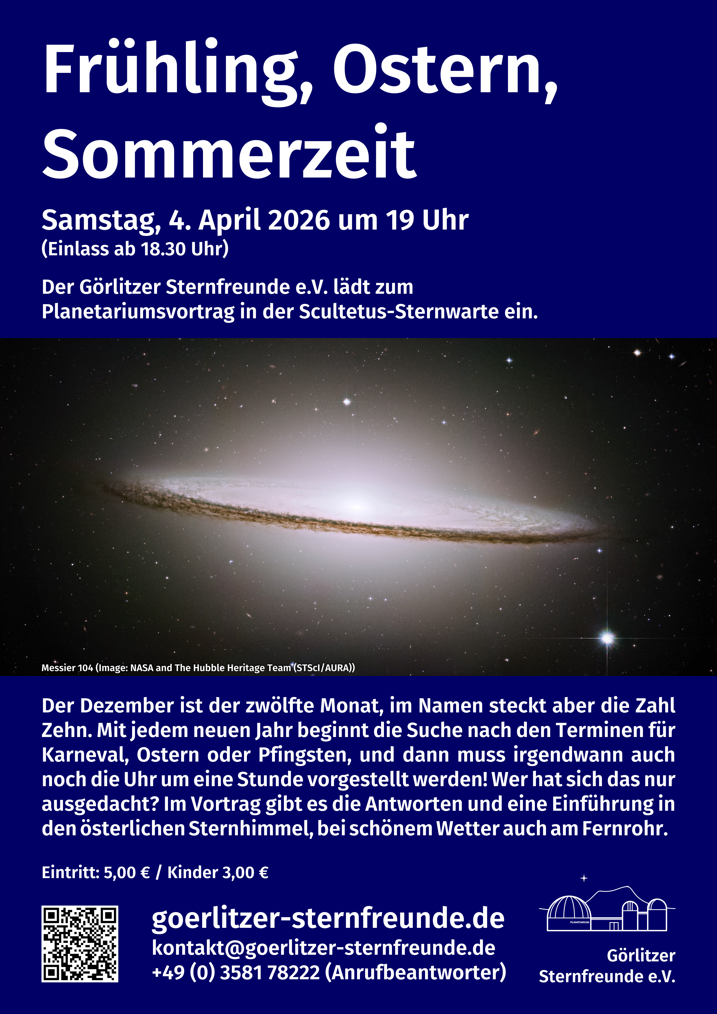 Im Vortrag gibt es die Antworten und eine Einführung in den österlichen Sternhimmel, bei schönem Wetter auch am Fernrohr.