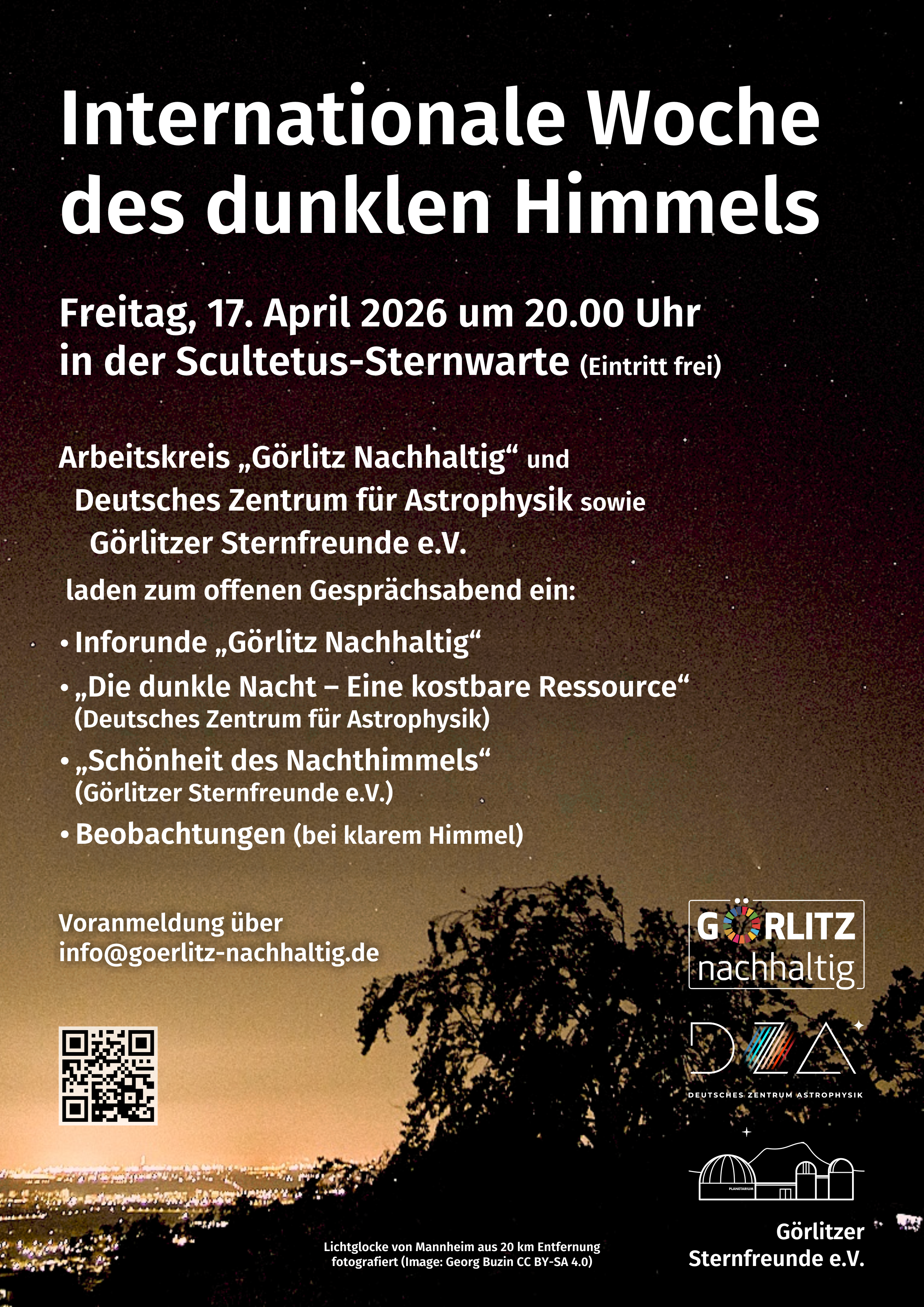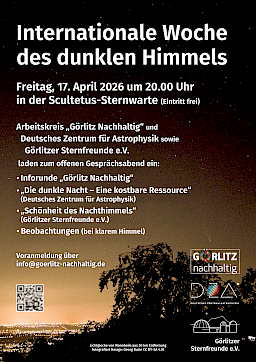 - offener Gesprächsabend des Arbeitskreises „Görlitz Nachhaltig“ zusammen mit dem Deutschen Zentrum für Astrophysik und Görlitzer Sternfreunde e.V.